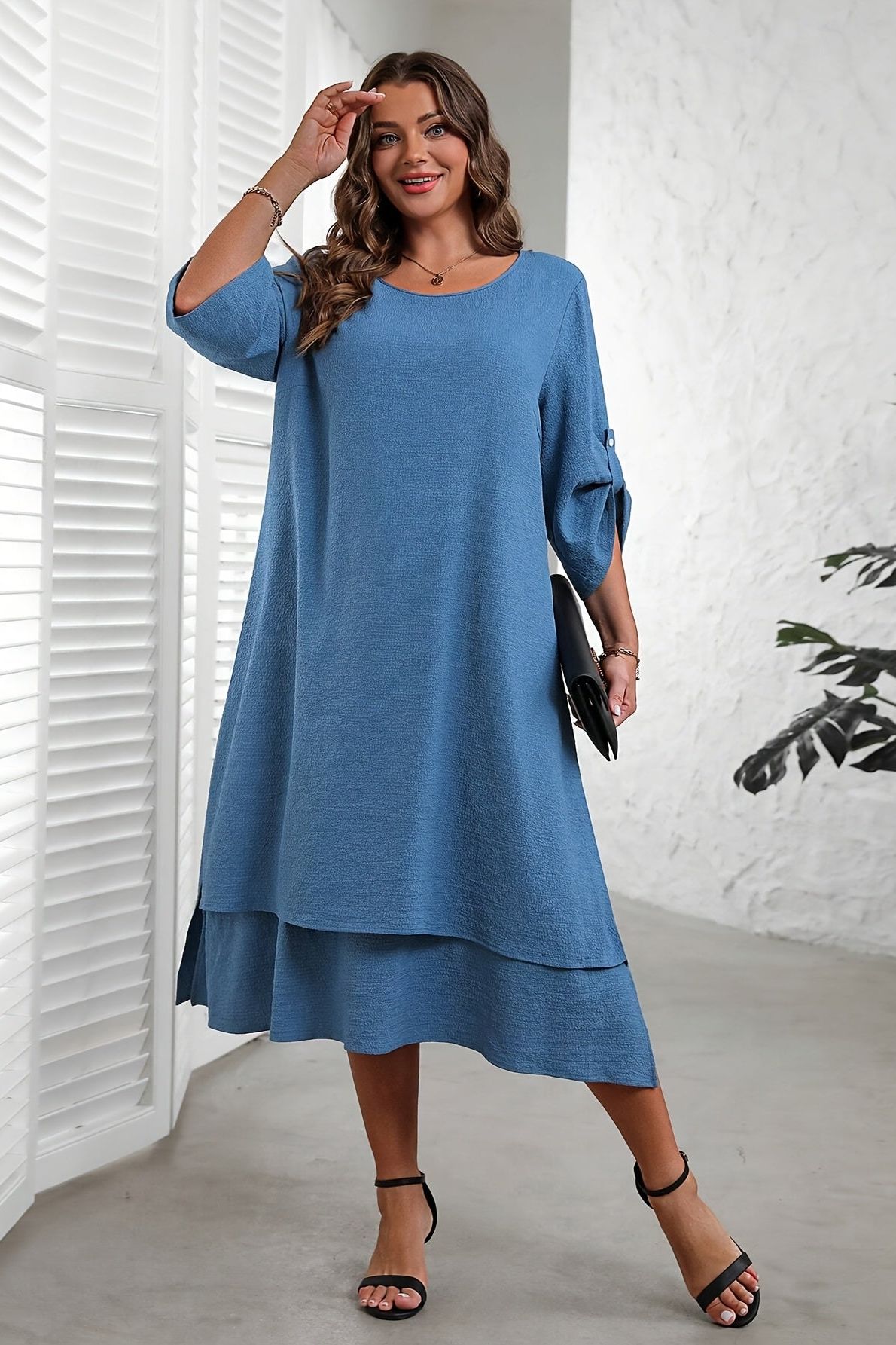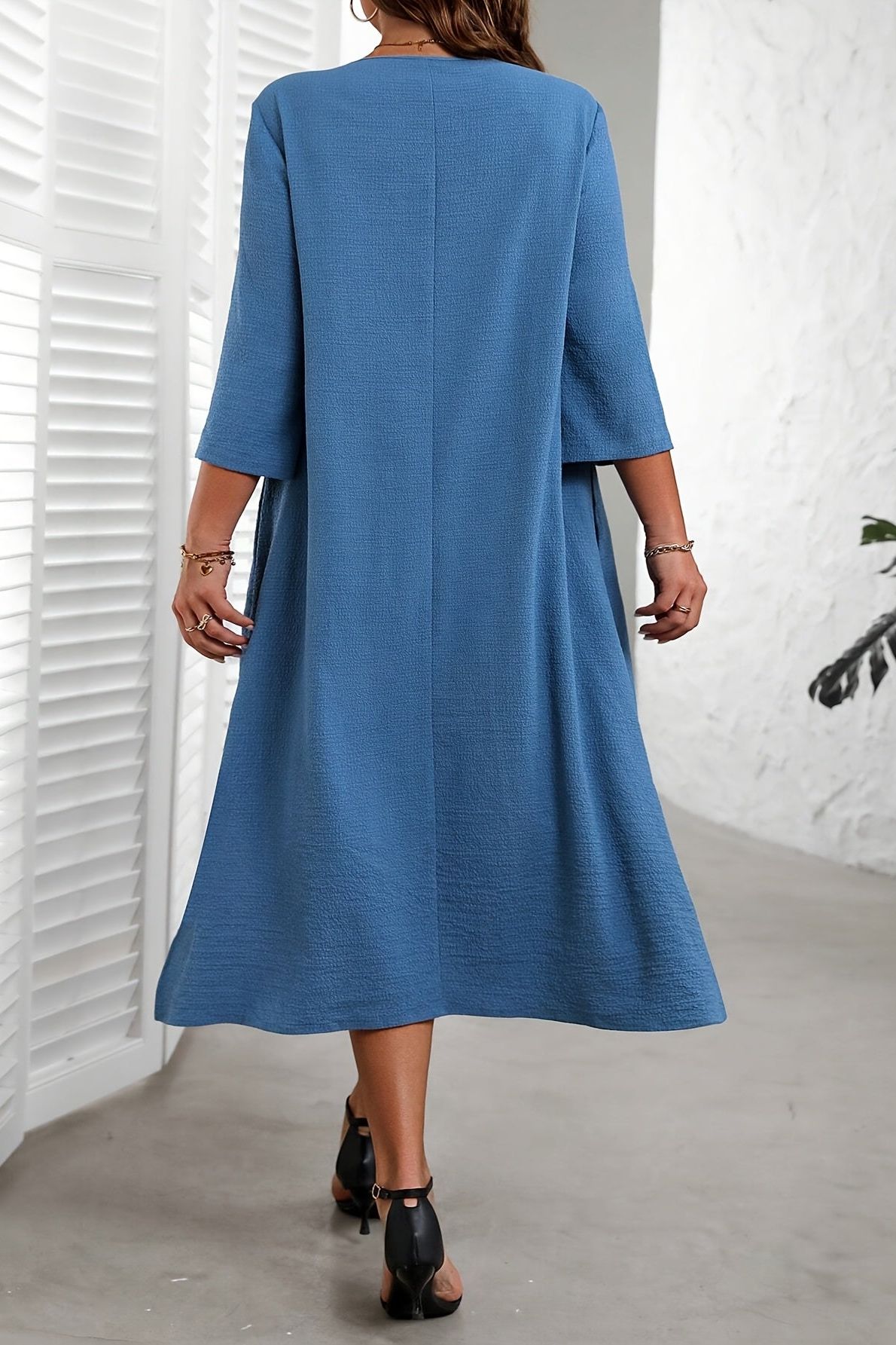 This midi dress features a flowing silhouette that gently flatters your waist and hips. The soft breathable fabric ensures lasting comfort throughout the day. Perfect for brunches, office wear, or relaxed evening gatherings.